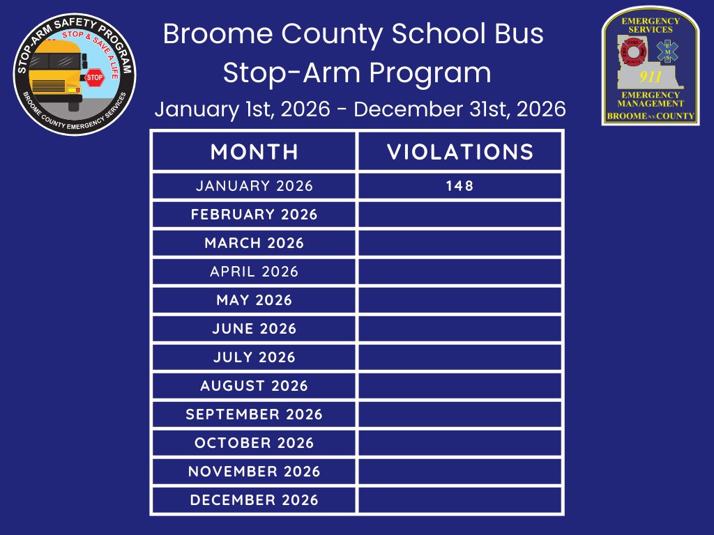 Broome County’s School Bus Stop-Arm Safety Program goal is public awareness and education. The success of the program is measured by the decrease in stop-arm violations over time and not by the number of vehicles found violating the law.