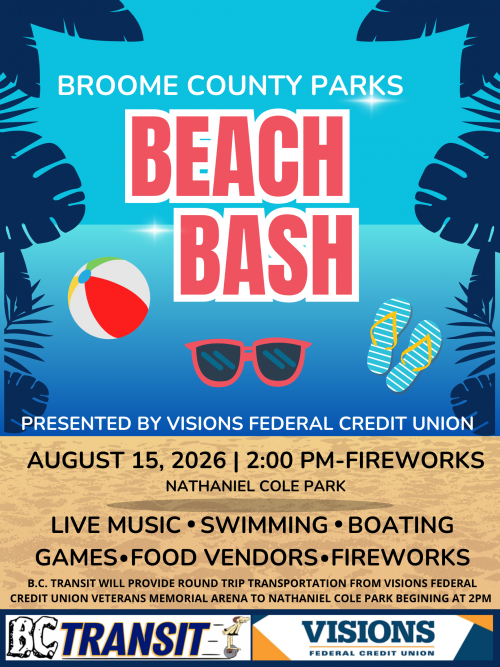 Mark your calendar and join us for the Broome County Parks Beach Bash at Nathaniel Cole Park on Saturday, August 15, 2026. This is a FREE family-friendly event is brought to you by Visions Federal Credit Union!