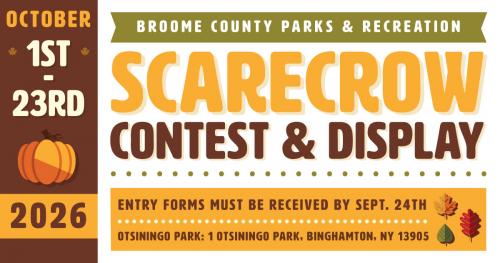 Join us at Otsiningo Park for the Broome County Parks and Recreation 10th Annual Scarecrow Contest & Display!
