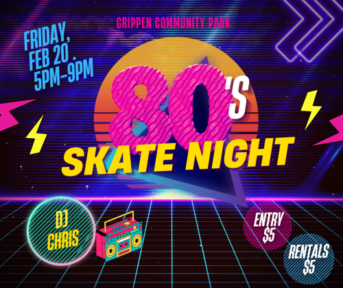 Ice Skating at Grippen Community Parks is $5 per session to skate and $5 for rentals per session. All skaters must sign a waiver to skate. Kids under the age of 18 need a guardian to sign their waivers. Kids under 12 years of age need to be supervised by an adult.