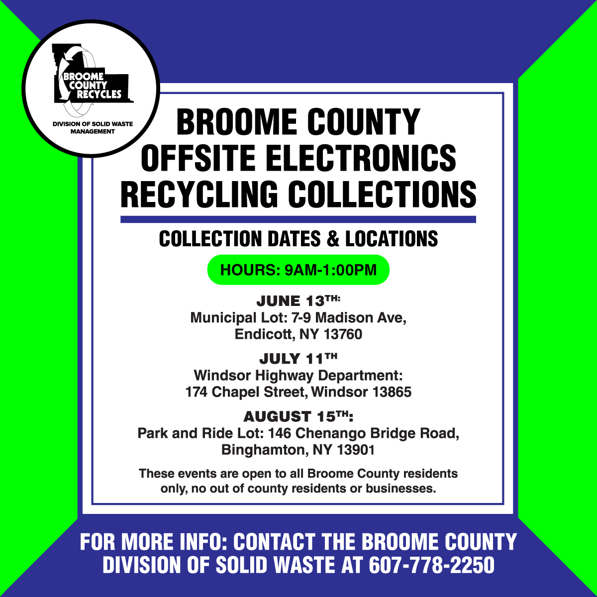 The Broome County Division of Solid Waste is hosting multiple offsite electronics recycling collections for all Broome County residents in June, July, and August.
