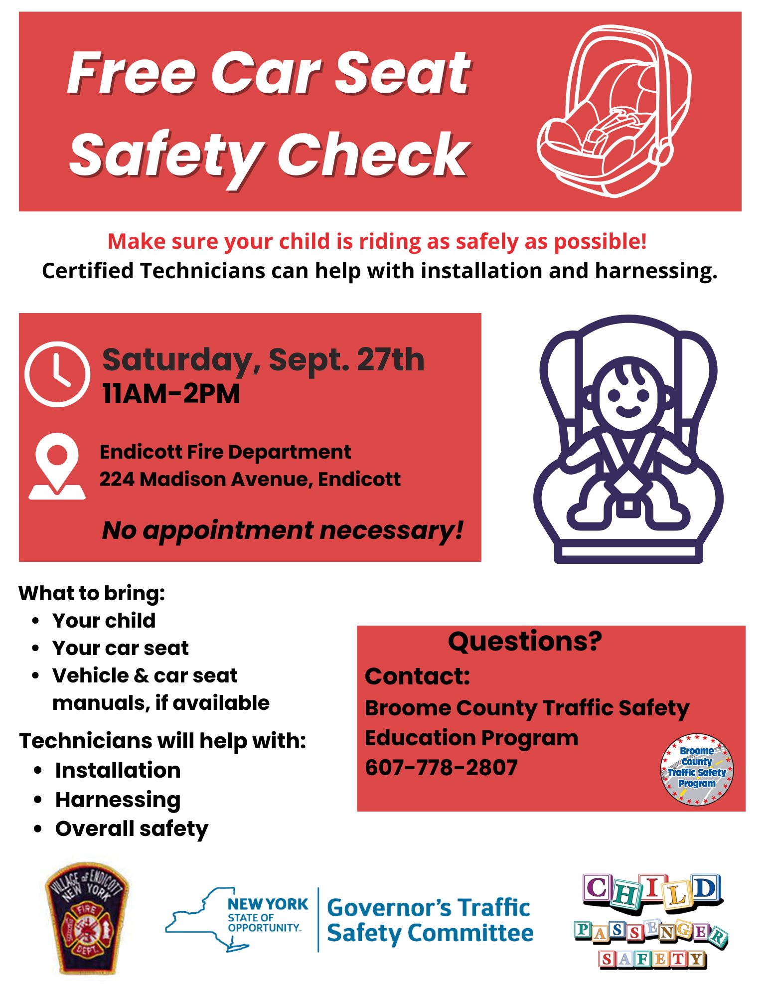 For questions about Child Safety Seat Check Events, call 607-778-2807.
