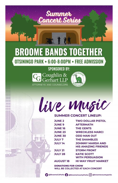 Individuals and families are invited to bring lawn chairs or blankets to theses family friendly events. Pack a picnic dinner, or purchase snacks, drinks and ice cream from Beer Tree Brew Co, Downtown Danny's, Here's the Twist and PitStop Popcorn. CHOW will be accepting non-perishable food and monetary donations at all Broome Bands Together Concerts. There will be bins placed around event area.