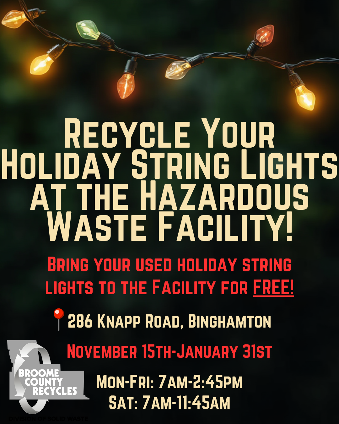 Will accept holiday string lights at the hazardous waste facility located at the Landfill from November 15, 2025-January 31, 2026.